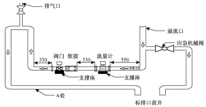 圖2中,溢流口出水后從高處往下,因為虹吸現象會將氣泡帶進流量計管路中,在U型彎的最高處安裝一個排氣口,溢流口和排氣口達到氣壓平衡,通過U型彎的擠壓在上升段中除去水中的氣泡,確保消減虹吸現象。此種方法較適合于重力流出水方式。為了確保企業安全生產,需要精確地計算出排水管徑的大小,安裝一個應急機械閥。