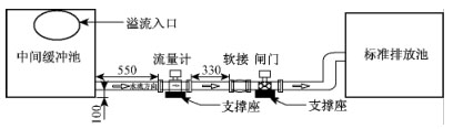 圖1中,溢流口出水后從中間緩沖池的高處流入,然后從池的低處流出經過流量計,經過向上的U型彎進入標準排放池。因為U型彎始終高于管路進口,水從U型彎流出必先填充滿管路,既保證了滿管,又提高了流量計的安裝精度。這種方法也較適合于重力/壓力混合流的出水方式。為了確保企業安全生產,需要在溢流口安裝一個總閥,并精確地設定緩沖池體積、管口高度、管路直徑等。另外,為了方便清洗流量計,建議在管路底部安裝排污閥門。