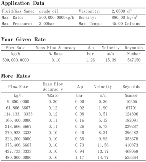 質量流量計以科氏力氏質量流量計(CMF)的應用較為廣泛,是通過測量科里奧利力進行流量測量。按照上述工藝條件,選用質量可靠的計量級質量流量計,按照計量標準選用精度為0.2級。流量計的口徑選用DN200,得到質量流量計的計算書如下: