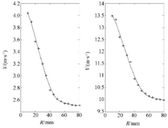 從表2中可以看出,雖然來流速度不同,但對應的等效半徑之間的差別卻不大,甚至可以說是非常接近的。取任意不同來流速度下計算域半徑和流速關系曲線圖進行比較,如圖2所示。從圖中可以看出,盡管流速不同,但計算域半徑卻是一樣的,即橫坐標一致,且曲線的形狀十分相似。因此,可以認為等效半徑的大小和來流速度無關。
