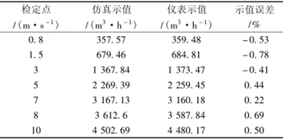 從表3數據可以看出,樣機測得的流量與仿真所得流量之間的誤差很小,其中最大的示值誤差也不超過-0.78%,充分說明了可以用等效信號作用范圍內的平均流速來代替被測管道截面內的平均流速的可行性,即驗證了等效信號作用范圍的存在和確定方法的正確性。