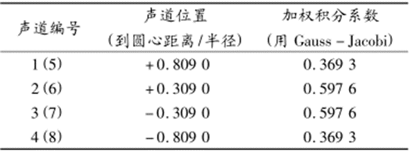 對于多聲道超聲流量計,其每個聲道的積分加權系數是一個固定值,并且在國際電工委員會的IEC6041規程和美國國家規程ASMEPTC18中作了明確的規定。為了滿足各種不同流態分布測量的需要,多聲道流量計具有多種聲道布置,對應每種聲道布置,積分加權系數都有確定的值。表1是國際電工委員會IEC6041規程關于4/8聲道超聲流量計的聲道位置和加權積分系數的規定值。