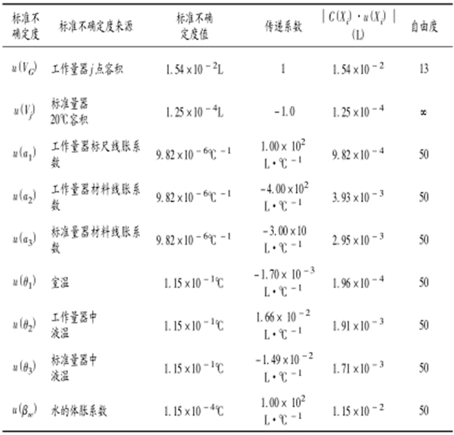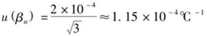 設檢定介質為水(βw=2.0×10-4℃-1),工作量器標尺及工作量器和標準量器材料為不銹鋼(a1,a2,a3均為17×10-6℃-1),θ1=27℃,θ2=19℃,θ3=17℃,標準不確定度計算如下: