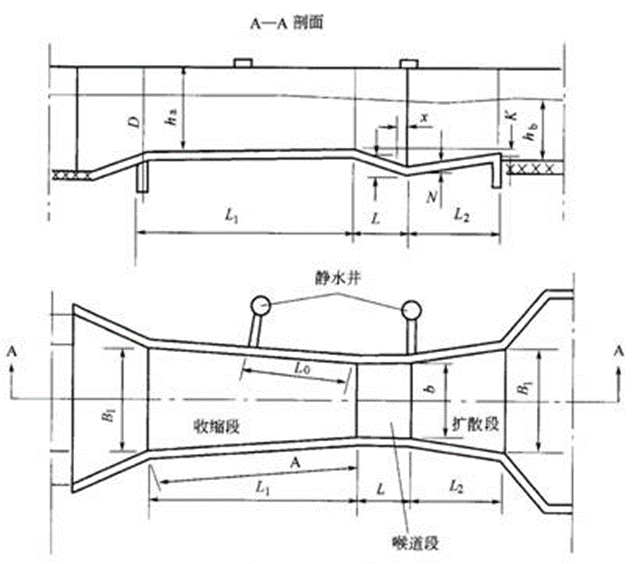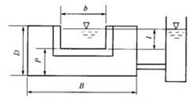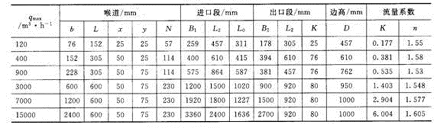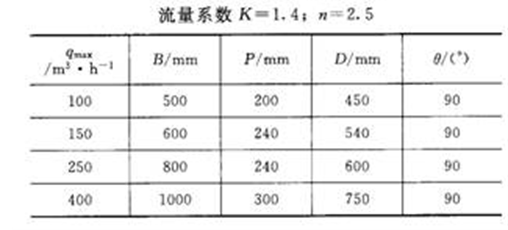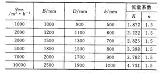 不同規格的槽或堰n、K值是不一樣的。使用和設計槽或堰必須參閱"明渠堰槽流量計檢定規程"(JJG 211-90)。這里僅給出一些三角形缺口薄壁堰、矩形缺口薄壁堰、等寬薄壁堰和巴歇爾槽的基本尺寸和K、n值,分別見表2~表6以及圖3~圖6。表6列出了各種槽堰可以測量的流量范圍。
