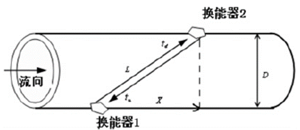 熱量表由流量傳感器、配對溫度傳感器和計算器三部分組成。流量傳感器為超聲流量計的熱量表稱為超聲熱量表。熱量表的流量測量準(zhǔn)確度直接影響到超聲波熱量表的計量性能。超聲波流量測量一般采用時差法計算流體的流速。時差法的測量原理見圖1。