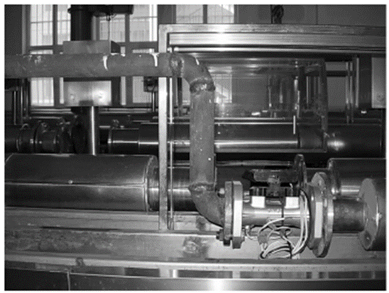 選取計量性能較為穩(wěn)定的兩種DN50超聲波熱量表,利用大口徑熱水流量標(biāo)準(zhǔn)裝置,進(jìn)行表后豎直彎管、水平彎管和直管段的流量測量對比試驗。第一種為表長30cm、十字導(dǎo)流片、縮徑設(shè)計的超聲波熱量表,第二種為表長20cm、十字導(dǎo)流片、縮徑設(shè)計的超聲波熱量表。根據(jù)熱量表說明書,將相應(yīng)的溫度傳感器插入表體,進(jìn)行超聲波聲速實時溫度修正。圖2為表后彎管流量檢測試驗圖。