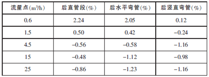 第一種超聲波熱量表在三種表后管段情況下,流量計量性能穩(wěn)定。三種表后管段情況下小流量點的流量差異相對較大,但均在誤差限范圍內(nèi)。在每個流量點,表后直管段、水平彎管、豎直彎管的流量示值誤差有依次降低的趨勢。隨著流量點的增大,檢測結(jié)果差異越小,每個檢測流量點的重復(fù)性均較好。