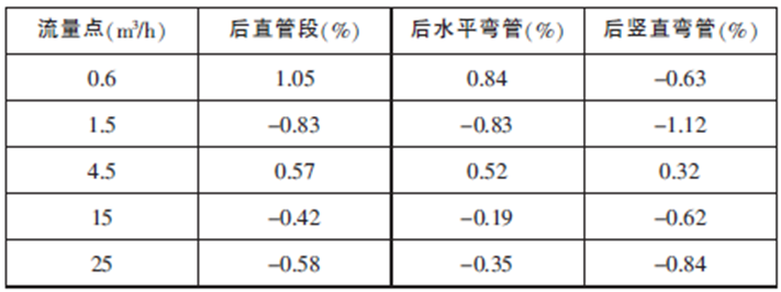 采用靜態(tài)質(zhì)量法標(biāo)定,在三種表后管段的條件下,選取0.6m3/h、1.5m3/h、4.5m3/h、15m3/h、25m3/h五個流量點,對超聲波熱量表進(jìn)行流量總量檢測,計算其示值誤差。在檢測過程中,調(diào)節(jié)流量點誤差在±5%以內(nèi),檢測時間為2分鐘,每個流量點檢測3次,測試結(jié)果如下。每個點的檢測結(jié)果取3次檢測的平均值。