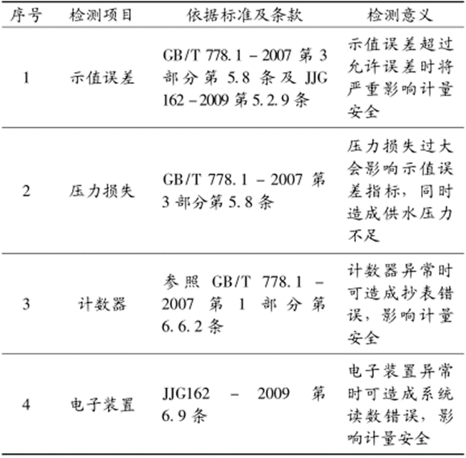 冷水水表檢測方法依據(jù)GB/T778.1-2007《封閉滿管道中水流量的測量飲用冷水水表和熱水水表》及JJG162-2009中有關(guān)使用中檢驗(yàn)及型式評價(jià)方面的內(nèi)容,涵蓋所有風(fēng)險(xiǎn)點(diǎn),水表一般應(yīng)覆蓋以下檢驗(yàn)項(xiàng)目,詳見下表。