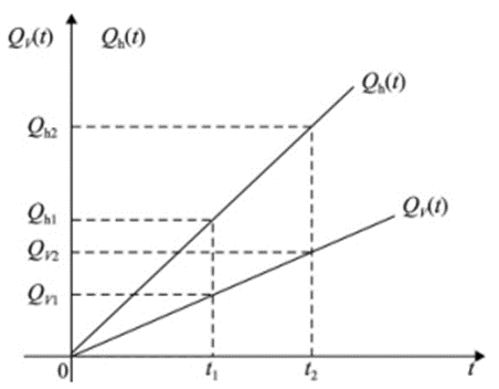 由式(2)和(4)可知,在某一特定時(shí)刻t,分別有與其相對(duì)應(yīng)的累積流量QV(t)和熱量Qh(t)二個(gè)量,即這是一組同時(shí)變化的三個(gè)量,見(jiàn)圖1。