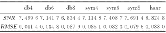 小波基函數選定為dbN(N=4,6,8)、symN(N=4,6,8)和haar,采取強制性去噪,尺度設定為8,去噪效果如圖3、4所示。表1為不同小波基下SNR和RMSE的統計數據。