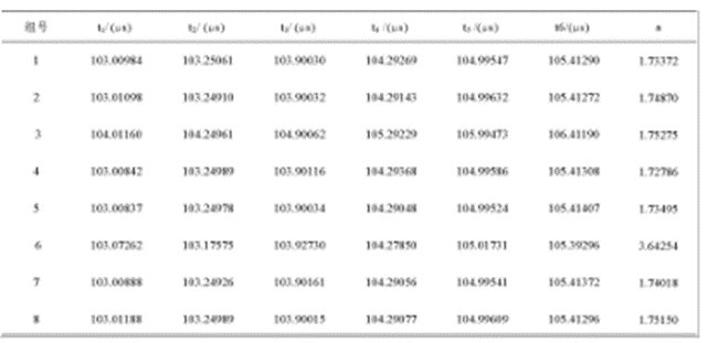 建立基于脈沖序列法時差法超聲波流量計系統(tǒng)后,在25mm管道上對其進行實驗驗證。首先系統(tǒng)測量了脈沖序列法所需的六個時間點數(shù)據(jù)用以檢驗脈沖序列法的效果,其測量數(shù)值如表2所示: