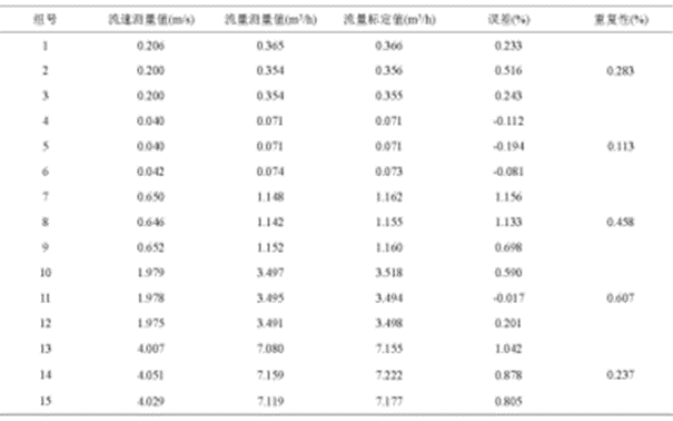 由表3的數(shù)據(jù)可知,25mm口徑管道流速在0.2~4m/s范圍內(nèi)精度都在1%左右,重復性在0.5%左右。根據(jù)GB/T778.1-1996標準可知口徑為25mm的管道常用流量為3.5m3/h,在該流量處測量精度和重復性均在0.6%左右,與市面上一些時差法超聲波液體流量計的精度和重復性相比有了一定的提升。