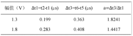 超聲波信號的包絡(luò)線為調(diào)幅載波的調(diào)制信號,其數(shù)學模型為指數(shù)衰減的高斯脈沖信號,確定函數(shù)后通過仿真獲得超聲信號第一個周期峰值分別為1.3V和1.8V的理論時間數(shù)值如表1所示: