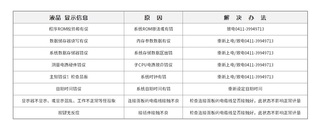 大連圣世援超聲波流量計(能量表)在每次上電的時候都要對硬件進行自診斷,硬件上電自檢信息及原因對策,上電后可能顯示的信息及解決對策如下表:
